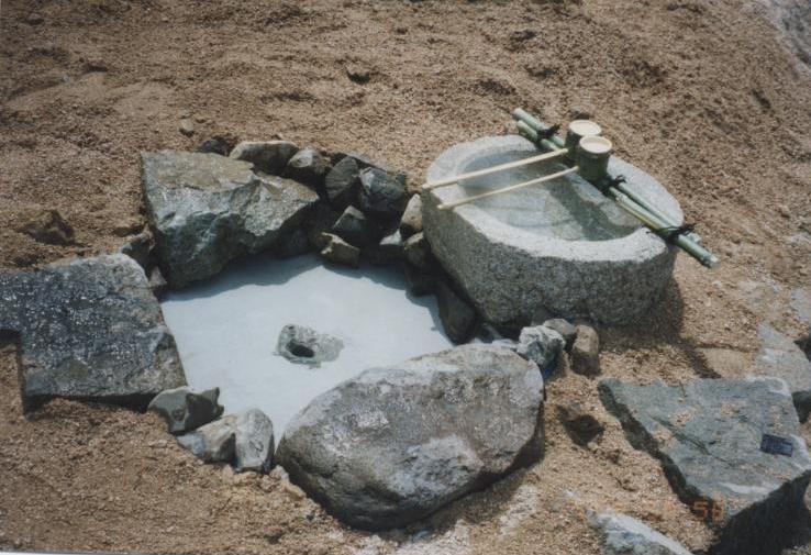 ●自作である事。甕の水深を決める為水面を変化させて実験し、決定。更に甕の穴径も実験をしながら決定。そして枠は井戸枠1000ミリのものを購入。甕と枠の間に石100ミリ位のを入れた。更に金網を張って石と甕の間に隙間約100-150ミリの隙間を設けて甕を設置している。従って音色は自慢ではないが、自分が聞いた範囲だが、他の水琴窟よりもずっと良い。 ●平成15年11月6日にNHK岡山放送局「きびきびワイド610」にてテレビ放映された。